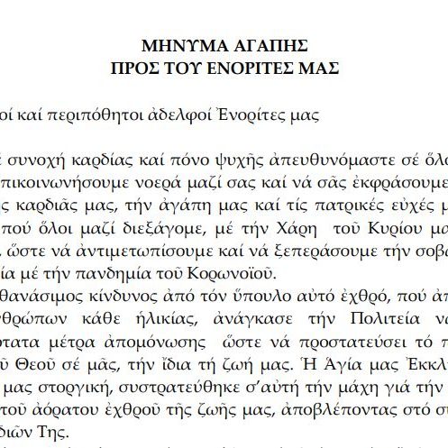 Ἀγαπητοί καί περιπόθητοι ἀδελφοί Ἐνορίτες μας Μέ συνοχή καρδίας καί πόνο ψυχῆς ἀπευθυνόμαστε σέ ὅλους ἐσᾶς γιά νά ἐπικοινωνήσουμε νοερά μαζί σας καί νά σᾶς ἐκφράσουμε, ἀπό τά βάθη τῆς καρδιᾶς μας, τήν ἀγάπη μας καί τίς πατρικές εὐχές μας στόν ἀγώνα, πού ὅλοι μαζί διεξάγομε, μέ τήν Χάρη τοῦ Κυρίου μας Ἰησοῦ Χριστοῦ,…