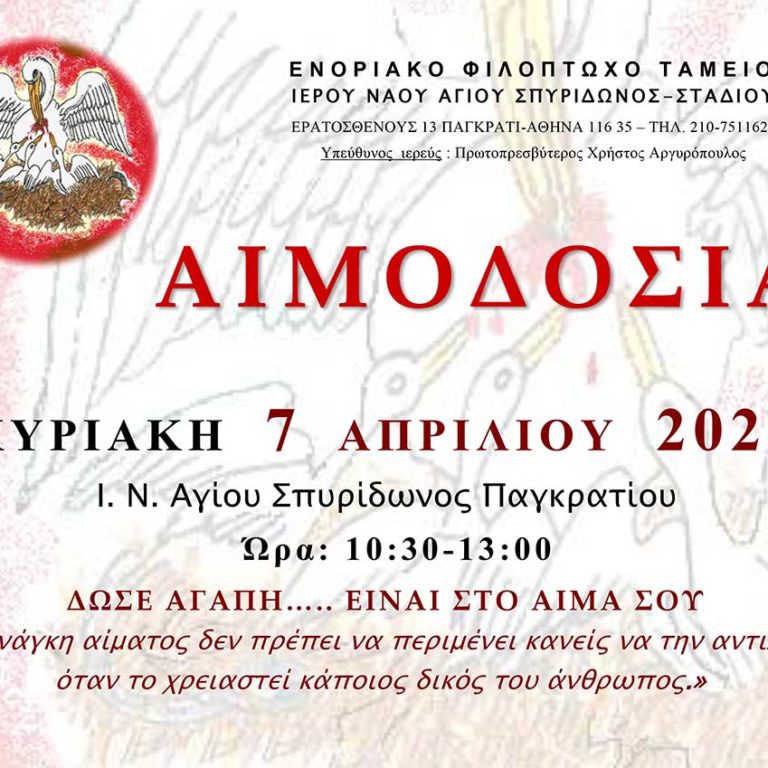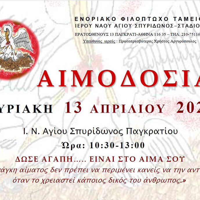 Αιμοδοσία στον Ι.Ν. του Αγίου Σπυρίδωνος Σταδίου την Κυριακή 13 Απριλίου 2025.