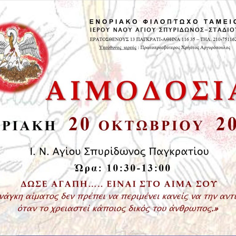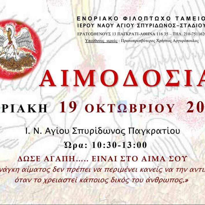 Αιμοδοσία στον Ι.Ν. του Αγίου Σπυρίδωνος Σταδίου την Κυριακή 22 Οκτωβρίου 2023.