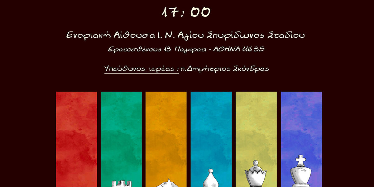 Το τμήμα Νεότητας της Ενορίας Αγίου Σπυρίδωνος Σταδίου (Ερατοσθένους 13, Παγκράτι), με υπεύθυνο τον Πρωτοπρεσβύτερο πατέρα Δημήτριο Σκόνδρα, διοργανώνει την Κυριακή 25 Ιανουαρίου 2026 το 2ο Παιδικό Τουρνουά Σκάκι στην Ενοριακή αίθουσα του Ιερού Ναού, δίπλα στα γραφεία των Ιερέων, στις 5:00 το απόγευμα.