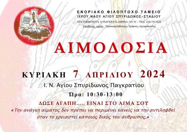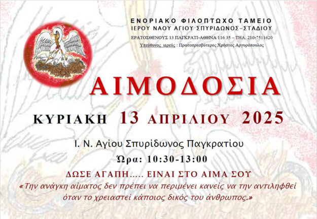 Αιμοδοσία στον Ι.Ν. του Αγίου Σπυρίδωνος Σταδίου την Κυριακή 13 Απριλίου 2025.