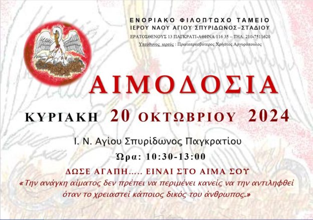 Αιμοδοσία στον Ι.Ν. του Αγίου Σπυρίδωνος Σταδίου την Κυριακή 22 Οκτωβρίου 2023.
