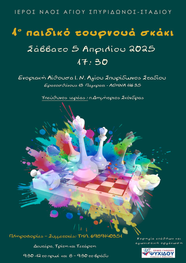 Tο Σάββατο 5 Απριλίου 2025 θα πραγματοποιηθεί το 1ο Παιδικό Τουρνουά Σκάκι στην Ενοριακή αίθουσα του Ιερού μας Ναού.